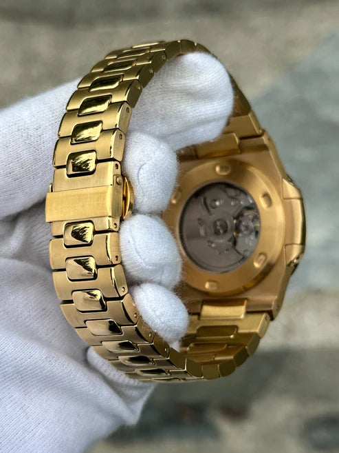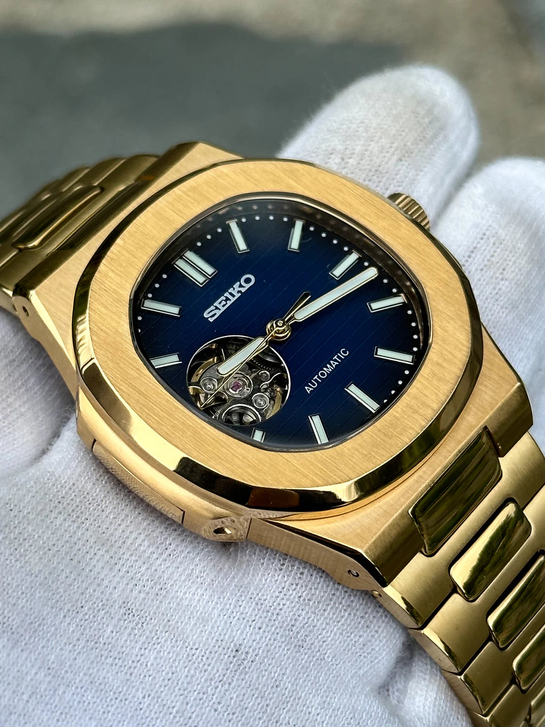 Nautilus Mod: Gold Black Blue Wave Dial - Seiko NH38 Open Heart