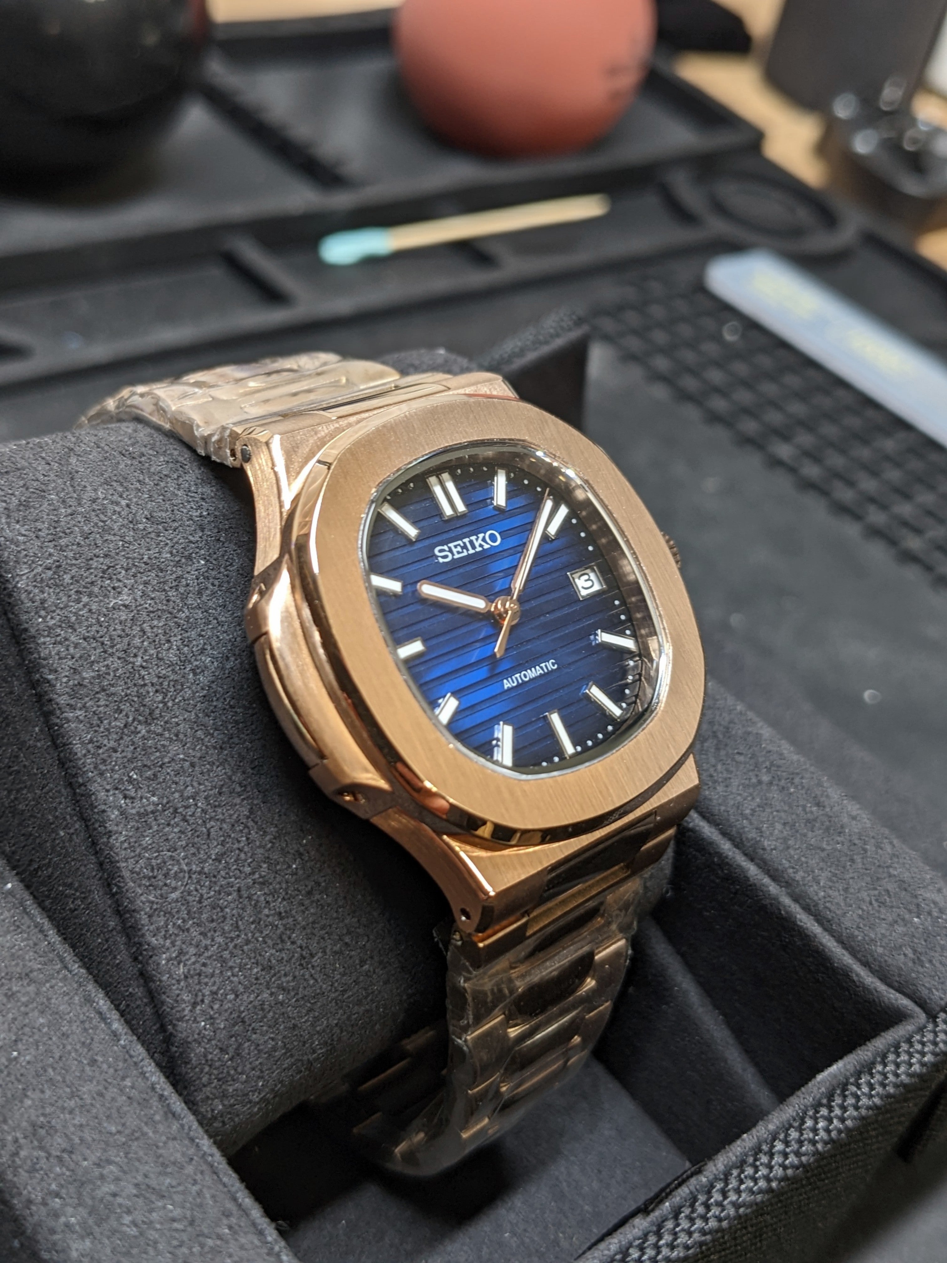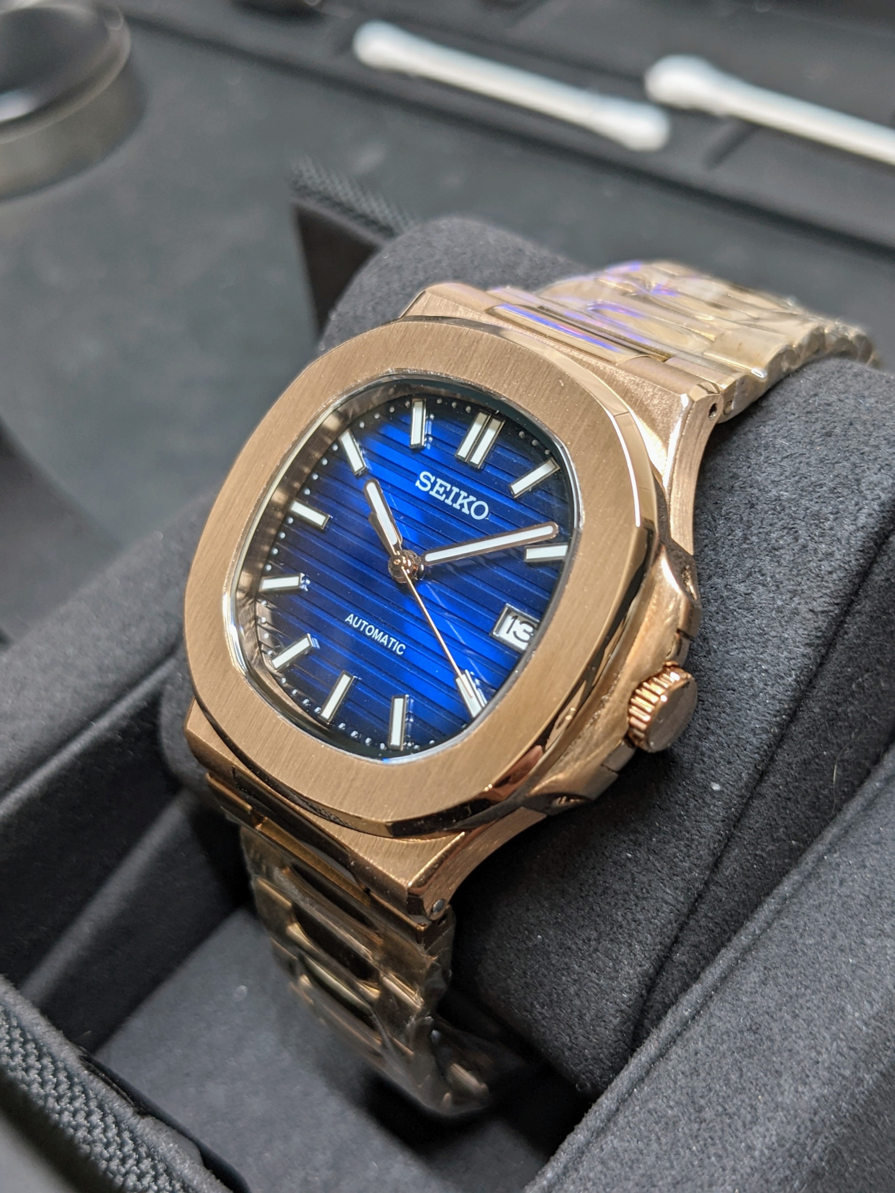 Nautilus Mod: Rose Gold Dark Blue Gradient Wave Dial - Seiko NH35 Auto